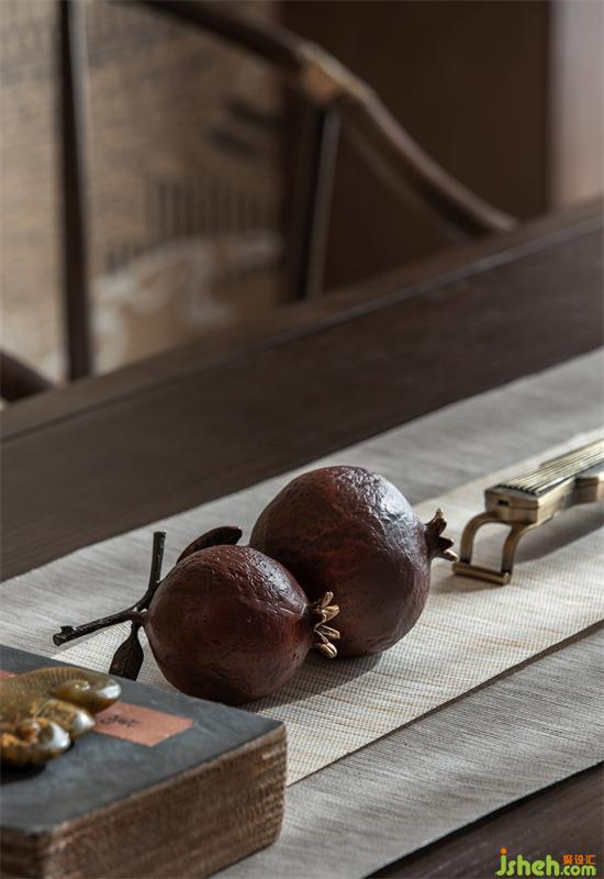茶室同樣以室內(nèi)景觀化的手法,讓空間心生溫暖。傳統(tǒng)文化元素提取的飾品及古典青銅器皿,古今互見,來自大自然中質(zhì)樸而原始的材料,將古時文士喜愛的雅興閑物納入空間當(dāng)中,與現(xiàn)代的空間共生,那一刻空間又重燃生命張力。兩者結(jié)合似又找到了搬運(yùn)大自然、重獲生機(jī)的美好。