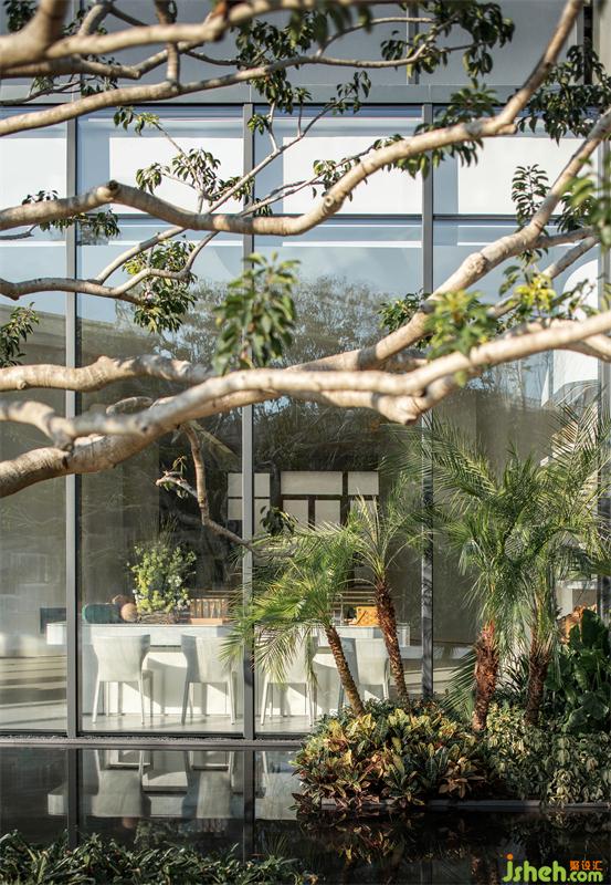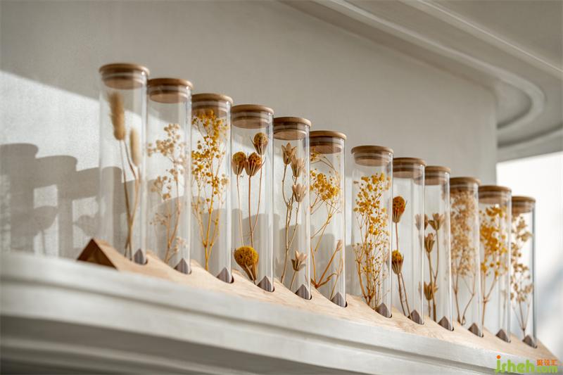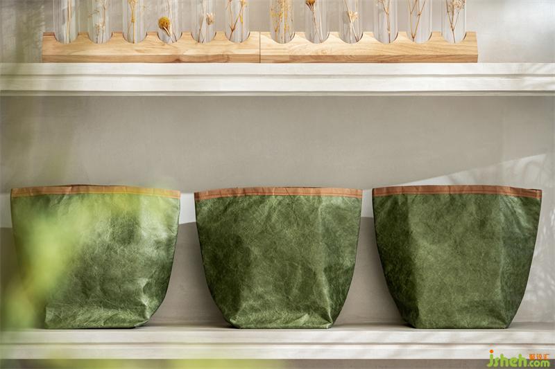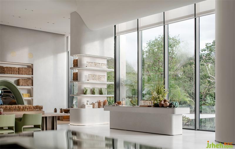 “蘆葦灘”的背后有一處拉槽肌理漆墻面,上面布置著懸吊于半空的苔蘚飾品:生活體驗館設(shè)計多米諾骨牌似排列的半透明裝置中封印著精致的、充滿藝術(shù)感的綠色苔蘚,影影綽綽,以小窺大,整個空間彌漫著親和的自然原始滋味。
