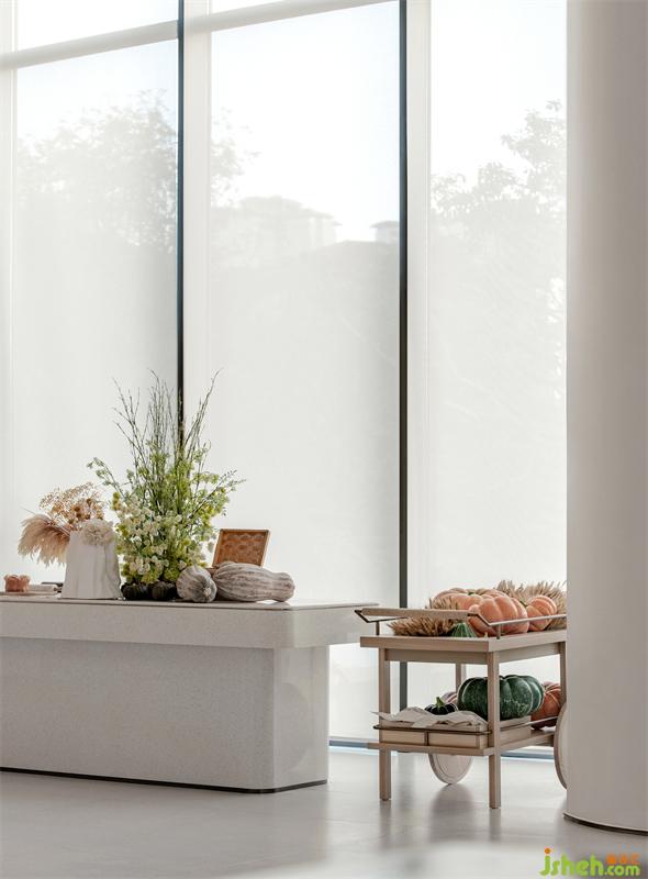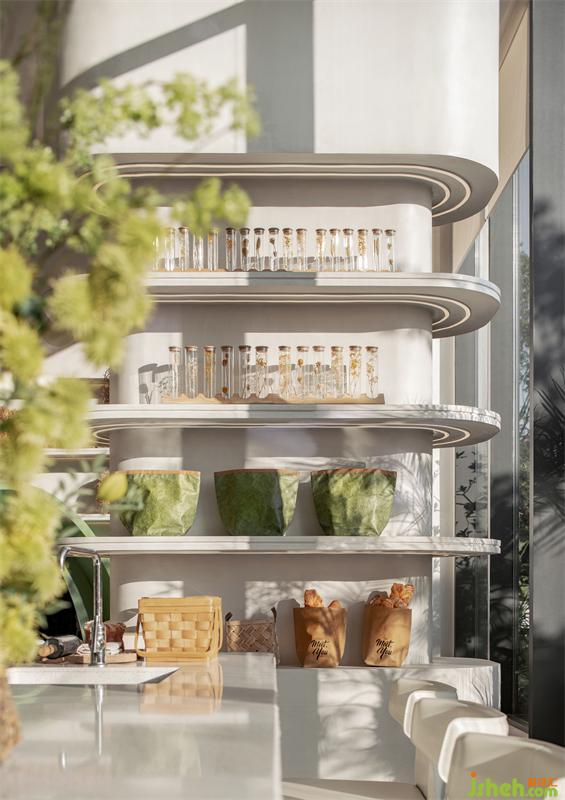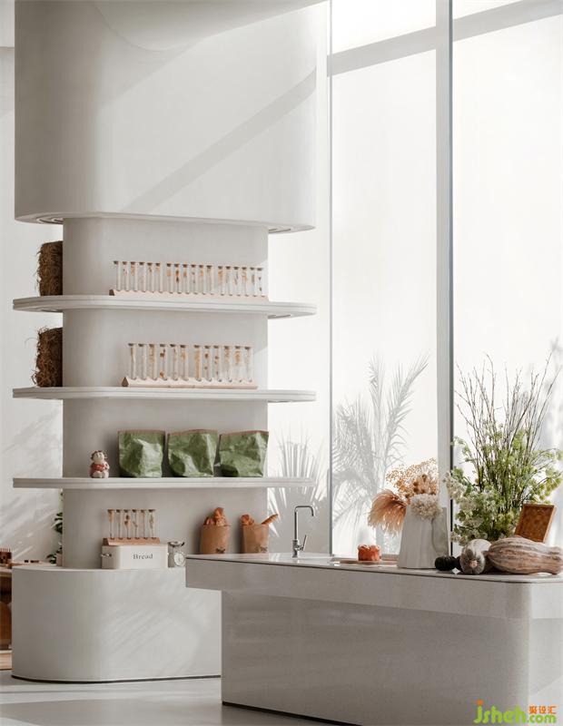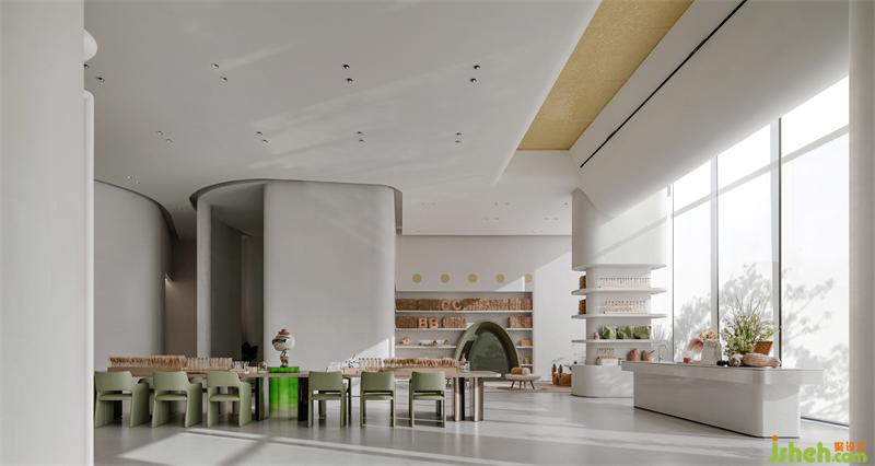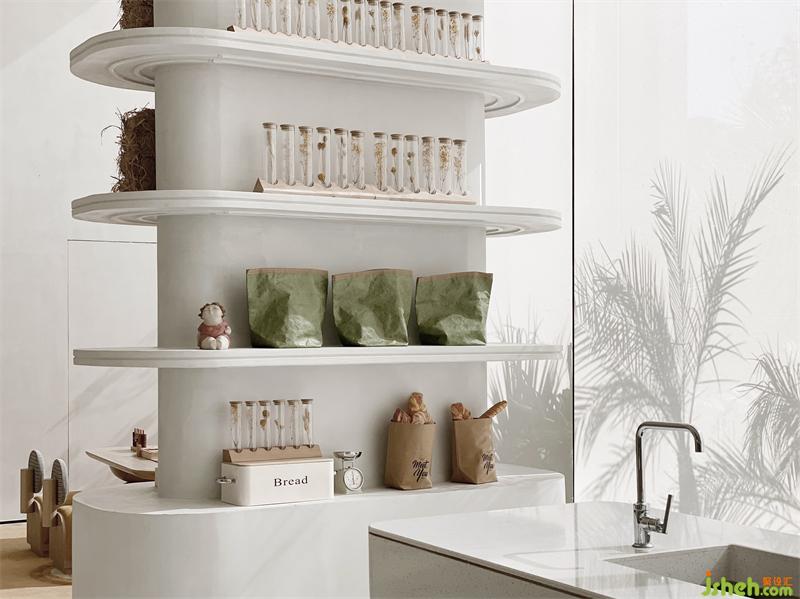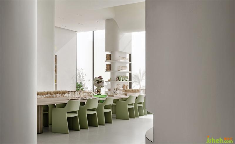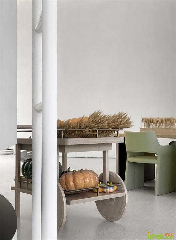 綠色的矮凳圍繞著木質(zhì)長桌,上面“長”滿豐收的麥穗,讓前來體驗藝術(shù)生活的孩童們?nèi)杠S,也讓成年人回憶起兒時的稻田,生活體驗館設(shè)計所有的煩惱都縮小,快樂都被放大。右邊的“南瓜田”里,一個個形狀各異熟透的南瓜和蔬果布置著島臺和手推車,空氣里浸滿瓜果的香甜。