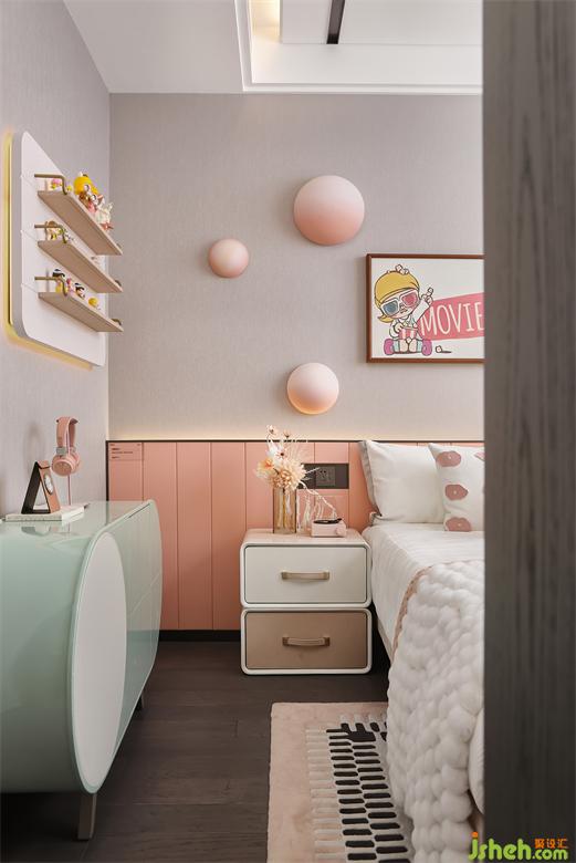 女孩的臥室采用淺粉色為主調(diào),墻壁的油漆肌理隱約展露出揮揮灑灑的設(shè)計(jì)手法。以此凸顯孩童純真的個(gè)性與美好向往。