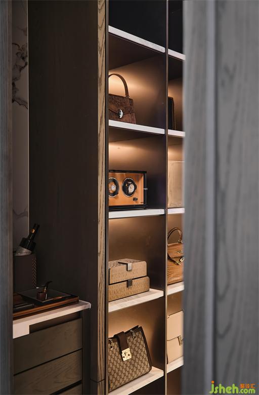 衣帽間與臥室的貫通,是空間延伸后的大氣磅礴,也搭建起了兩個(gè)空間互動(dòng)的更多可能性。