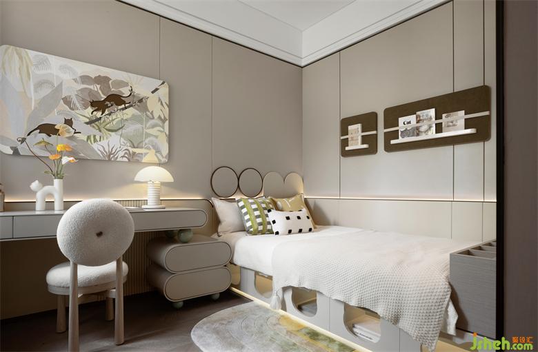 女孩房以貓咪為主題的設(shè)計(jì),增加書(shū)桌及墻柜功能,打造童趣、與貓玩樂(lè),學(xué)習(xí)一體的溫馨空間。女兒正是處在夢(mèng)幻般的年紀(jì),清新甜美的糖果色,線條柔和的童話床靠,都在小心翼翼地呵護(hù)著孩子的爛漫與童真。