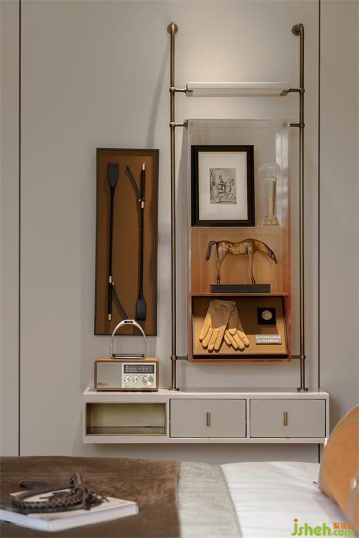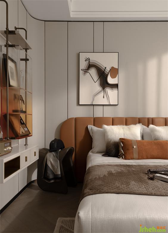 女孩房空間里大量使用了粟殼色和橘色的組合,其色彩氣質(zhì)相當(dāng)符合愛馬仕的色彩搭配原則,貴氣十足,而多處運(yùn)用的皮毛材質(zhì),則給人以熱情奔放的感覺又兼具了自然之美??臻g里放置的馬鞭、馬術(shù)帽,馬術(shù)裝備包,像是行走在藝術(shù)的空間里,在講究的細(xì)節(jié)中,感悟怒放的生命。