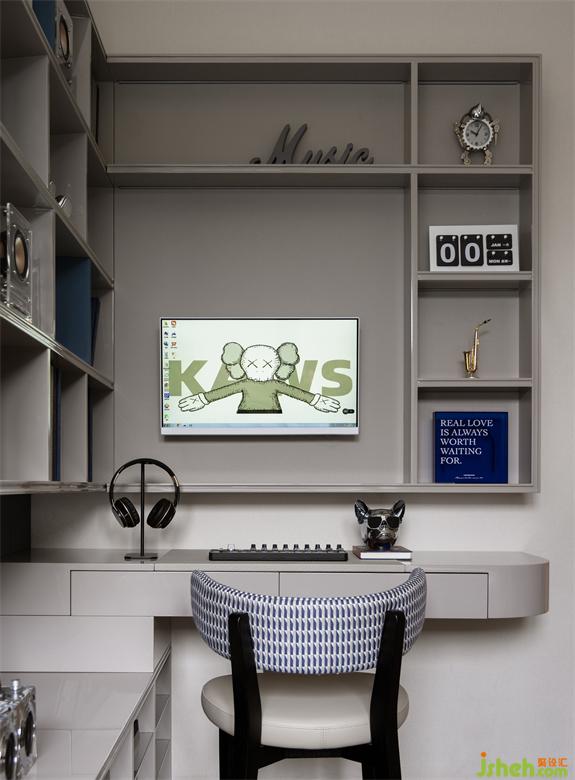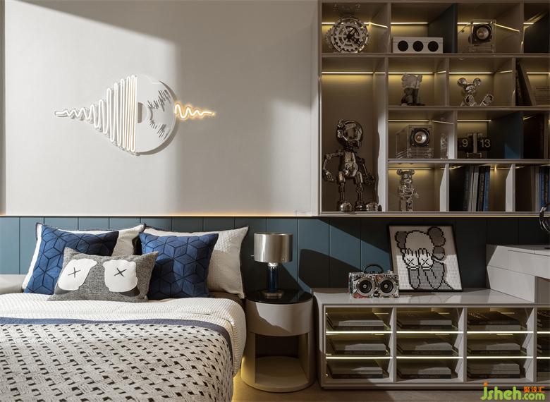 男孩房設(shè)置手辦墻,演繹收納和場景化展示設(shè)計(jì),潮牌Kaws暴力熊,散發(fā)著濃厚的波普藝術(shù)氣息,深邃的藍(lán)為空間注入理性感,以時(shí)尚先鋒的個(gè)性主張,定制專屬年輕人的生活場景,一處充滿自由精神及時(shí)尚藝術(shù)的棲居地。