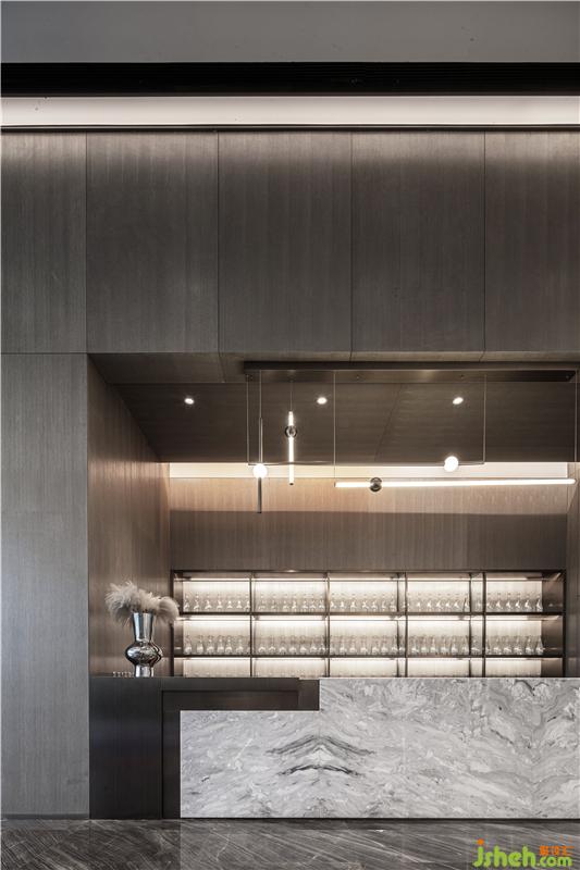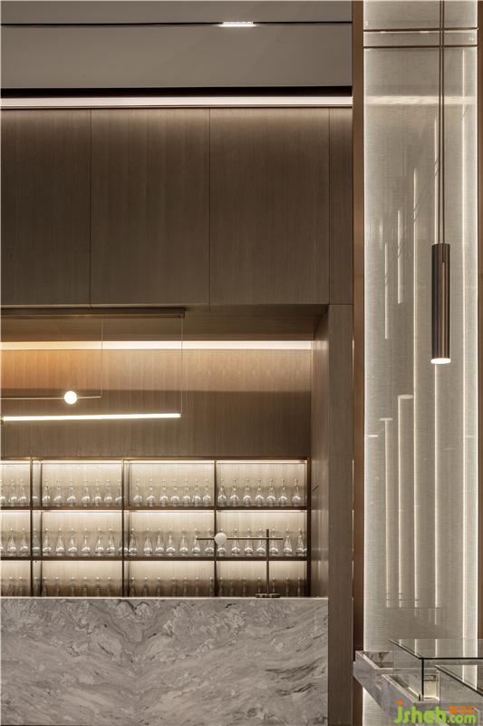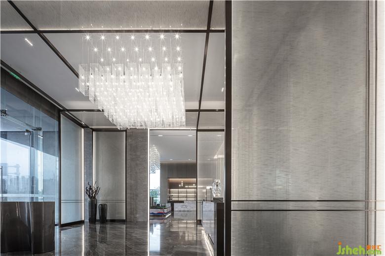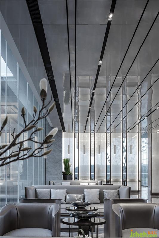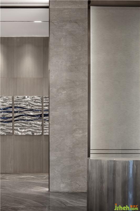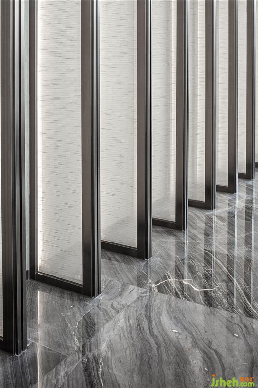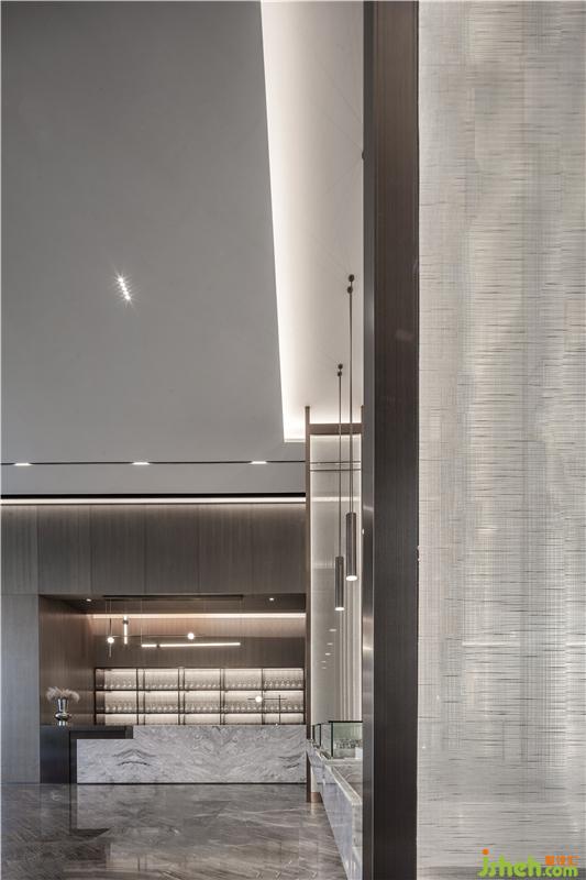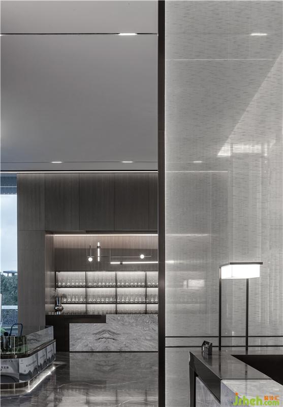 絹帛,古代絲織物總稱,在沒有紙張之前,是重要的畫布。售樓處設(shè)計設(shè)計師運用茶色夾絲玻璃做屏風,陣列式排布,模仿絹帛之形態(tài),以素練屏風為紙,水色人來為繪,形成一幅幅生動的場景畫面。