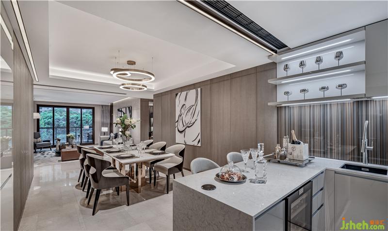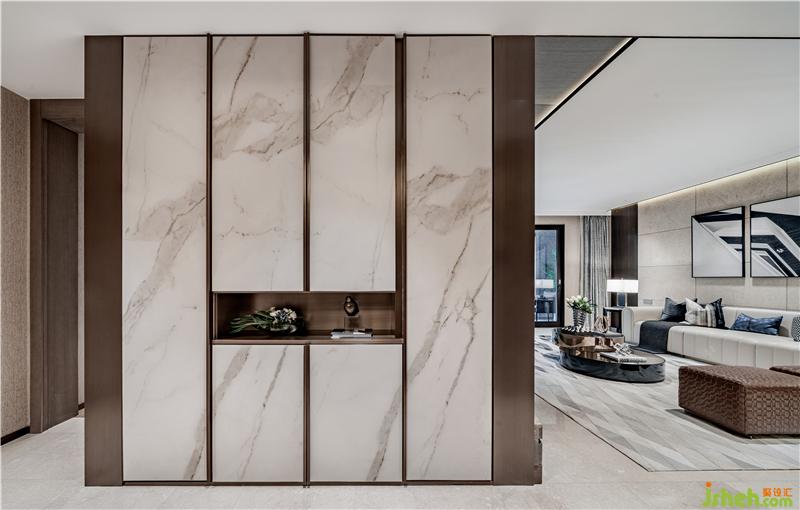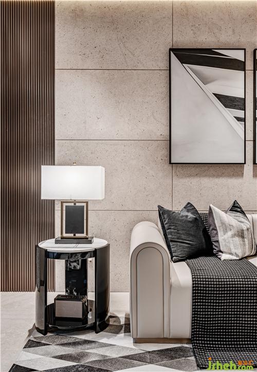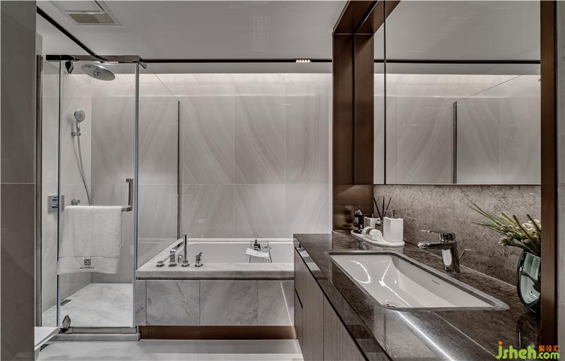 獨(dú)立衛(wèi)生間,墻面與地面由同款石材一體而成,深色材質(zhì)恰到好處的融合與均衡。雙臺(tái)盆樣板房設(shè)計(jì),合理的規(guī)劃分割,完美實(shí)現(xiàn)功能與美感的結(jié)合。