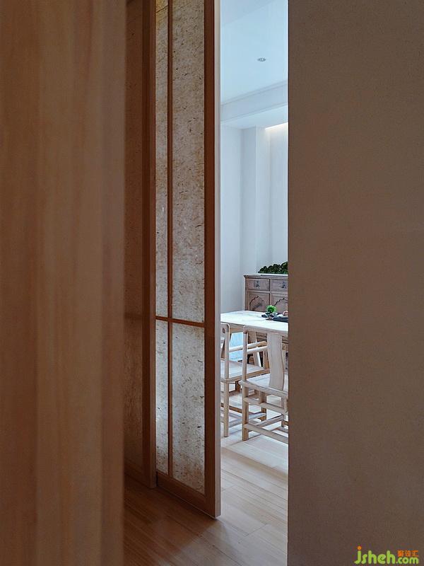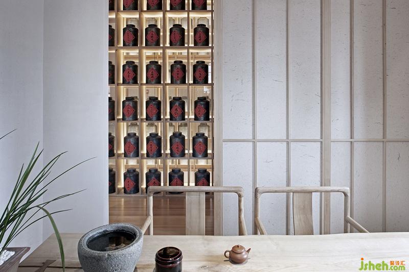 “輕似蟬翼白如雪,抖似細(xì)綢不聞聲”是古人對(duì)宣紙的由衷美贊,我們也將它應(yīng)用至空間。左側(cè)的陳列柜一面放置茶產(chǎn)品一面放置精致器皿,中間用玻璃作為隔斷,純凈的玻璃雙面糊上一層薄薄的宣紙,自然光經(jīng)過隔層的過濾,沾染了月籠輕紗般的美感,光與影在空間內(nèi)上演和諧的旋律,如梵婀玲上奏著的樂曲。
