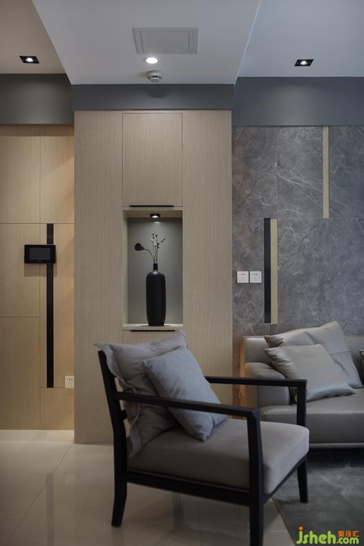 材料:拋釉磚、亞光磚、科技木飾面、黑色拉絲不銹鋼、硬包、復(fù)合木地板