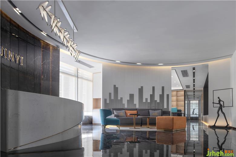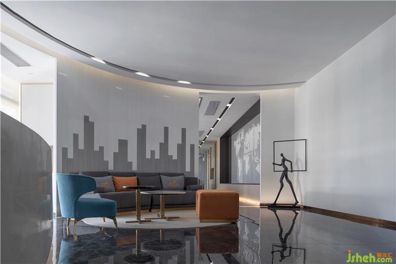 前臺(tái)區(qū)域作為辦公室的初步印象,投射藝術(shù)感?;∶嬖煨凸蠢找粋€(gè)整體的空間,面與面之間相互交匯、重疊、融合,與一側(cè)的藝術(shù)品進(jìn)行趣味對(duì)話。辦公室設(shè)計(jì)
