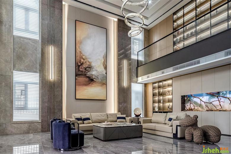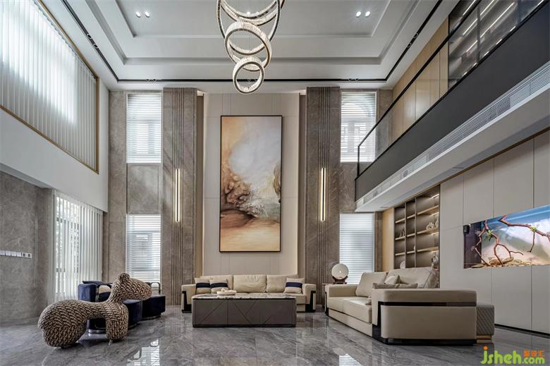 7米超大挑高沙發(fā)背景墻與電視背景墻對(duì)稱(chēng)布局,彰顯大宅恢宏氣韻。細(xì)節(jié)處設(shè)計(jì)師從自然山水文脈中吸取內(nèi)涵,創(chuàng)造現(xiàn)代藝術(shù)掛畫(huà),自然與藝術(shù)的巧妙結(jié)合,寫(xiě)意一方經(jīng)典,定制一座專(zhuān)屬于居者的品味空間。
