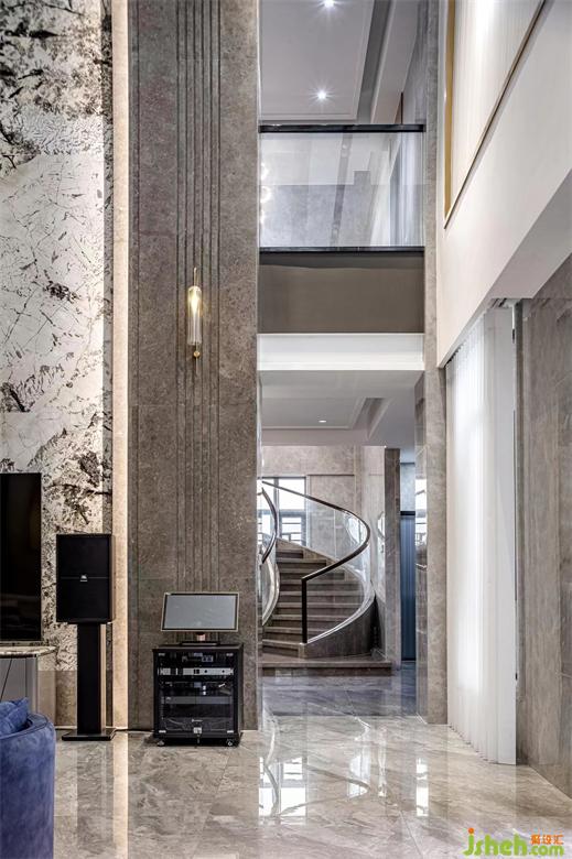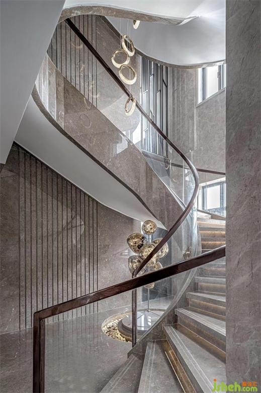 作為連接二樓休息區(qū)的樓梯,別墅裝修設(shè)計(jì)師同樣富有獨(dú)特見(jiàn)解。樓梯扶手與墻壁分離的設(shè)計(jì),宛若一件精美的雕塑,將現(xiàn)代韻律展現(xiàn)得淋漓盡致。