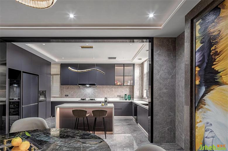 餐廳延續(xù)整體風(fēng)格,空間輕快溫和。木質(zhì)收納柜舍棄花哨的造型,回歸舒適與寧?kù)o。別墅裝修設(shè)計(jì)開(kāi)放式中西廚,引入自然采光,營(yíng)造自由無(wú)界的美好體驗(yàn)感。中島臺(tái)的設(shè)計(jì)開(kāi)啟了一家人間的互動(dòng)時(shí)光,設(shè)計(jì)營(yíng)造出隨和親切的居住環(huán)境,讓疲憊忙碌的心靈在此得到慰藉和放松。