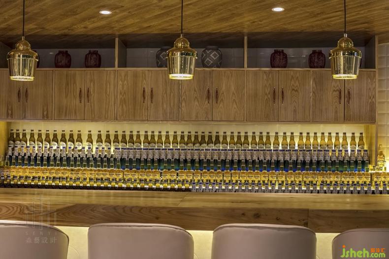 吧臺的設(shè)計(jì)是歲月沉淀下來的復(fù)古,金屬古銅吊燈與天然紋理制成的木式吧臺成了最佳搭檔,錯(cuò)落有致的酒品陳設(shè)融入空間,帶著酒香也釋放著豪放的氣息。