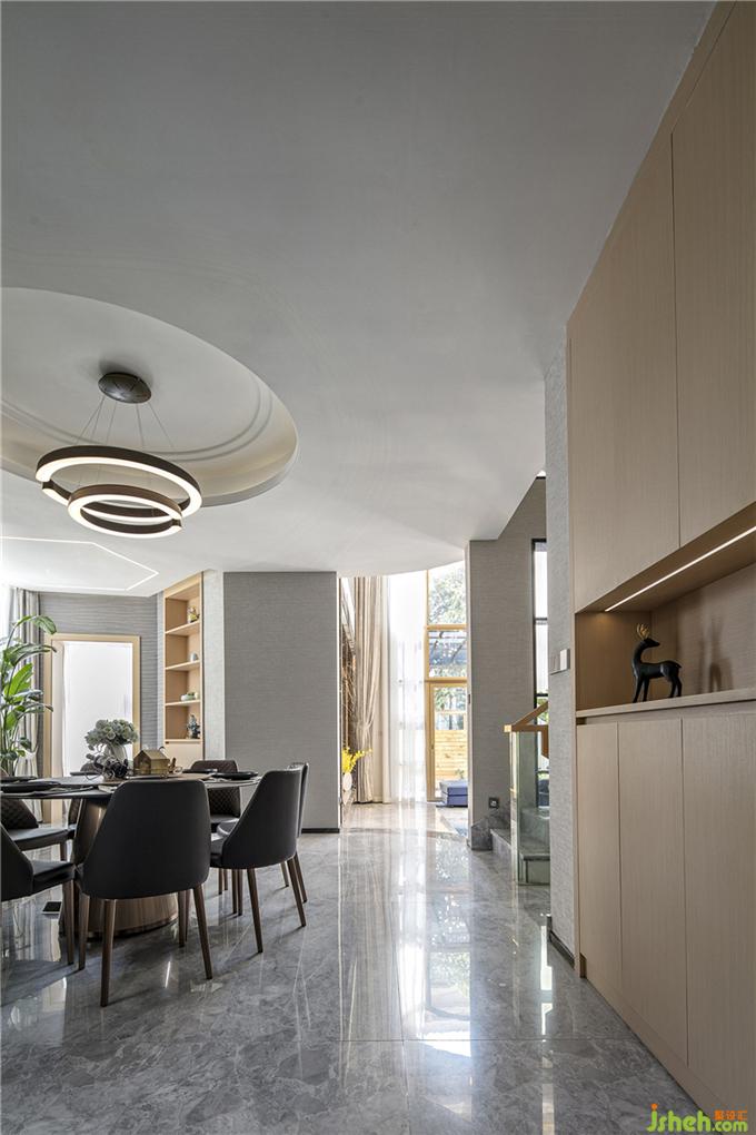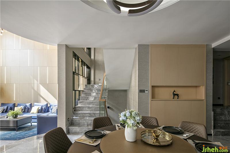但僅僅體現(xiàn)設(shè)計(jì)感是不足以演繹生活溫度與情緒,要讓生活更貼近生活,拉近居住者與各個(gè)空間的距離,空間動(dòng)線結(jié)構(gòu)的深度與廣度在功能性空間較密集的一層格局中,合理劃分就顯得尤為重要。曲緩交織的餐廳設(shè)計(jì),視覺(jué)上減輕裝飾中重量感,僅一幅畫、一圓天地的簡(jiǎn)單設(shè)計(jì),還原空間本質(zhì),使其變得通透純粹。別墅裝飾