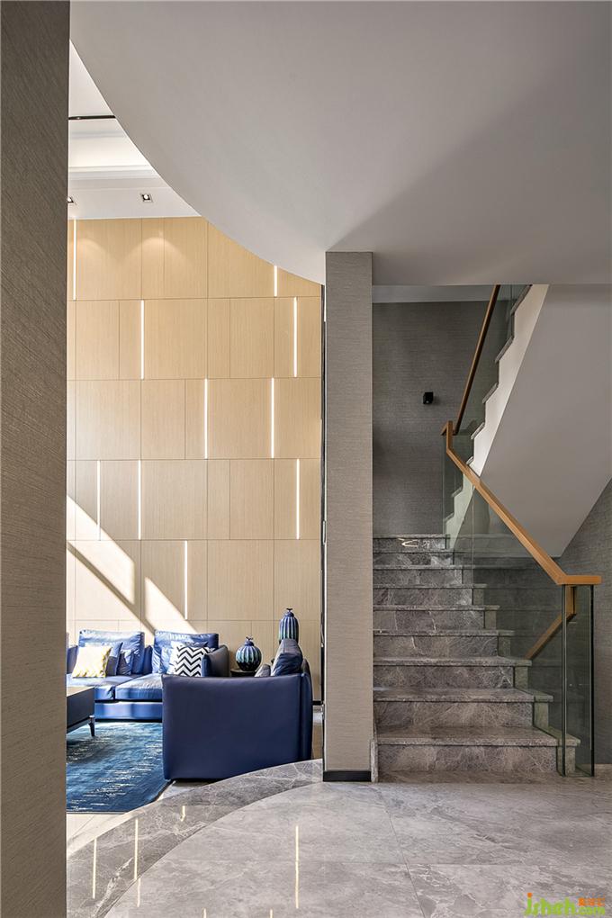 客廳是整個(gè)空間人文之美的濃縮與居住者生活品味表現(xiàn)。高挑的中空設(shè)計(jì)、地毯與家具擺飾都采用了藍(lán)色系列,如同天海,又若虛空與宇宙,中間以原木銜接,點(diǎn)綴燈飾幻影,水滴狀吊燈藝術(shù)裝置,與墻面錯(cuò)亂簡(jiǎn)約的豎條燈光在自然的光影里,形成錯(cuò)落有致,動(dòng)靜相宜的畫面,當(dāng)窗外風(fēng)景的色彩隨著四季流轉(zhuǎn),唯有陽(yáng)光一如既往,毫無(wú)保留傾瀉而下,映照著這靜雅的空間。