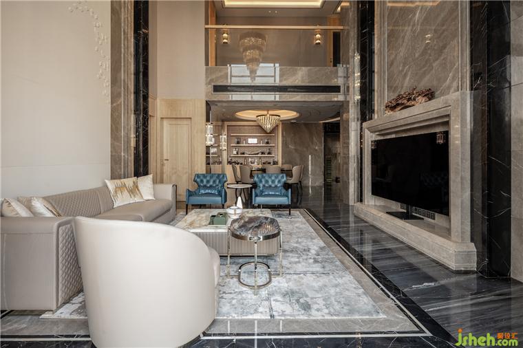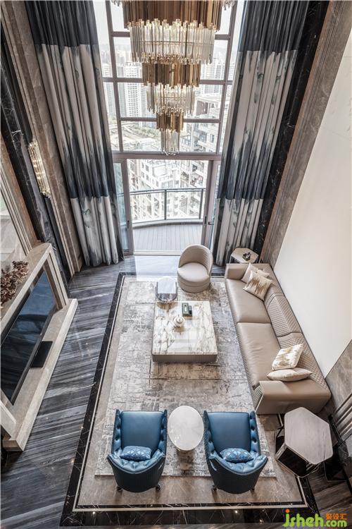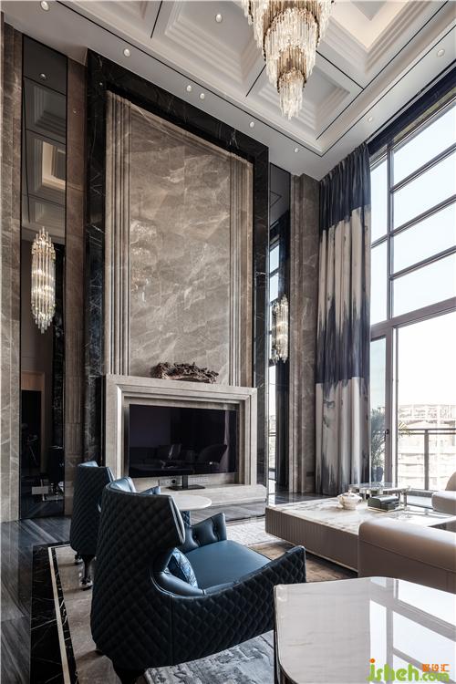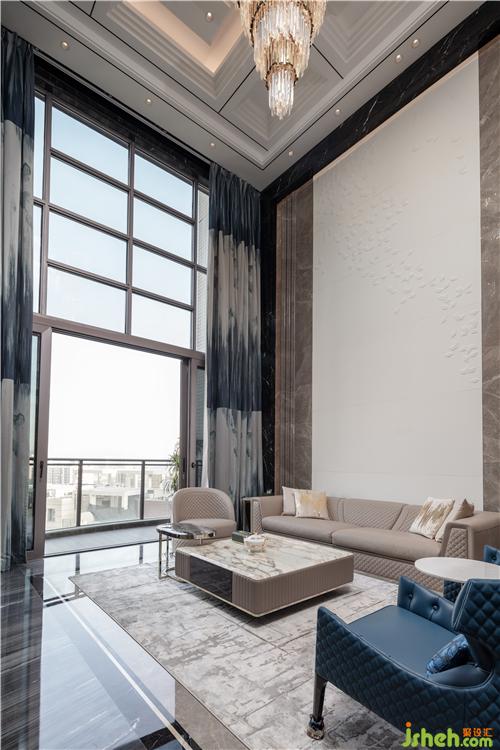 從玄關(guān)進(jìn)入挑高開(kāi)闊的客廳,灰色大理石與水晶吊燈碰撞出的藝術(shù)張力,兼具秩序感與靈動(dòng)性,點(diǎn)綴天海般純凈的藍(lán)色,演繹出浩瀚蒼穹,這源于人們對(duì)于山巒、流水、叢林、天空天然的向往,它們一方面象征著自然力量,可以不斷滋養(yǎng)內(nèi)在精神,一方面溫潤(rùn)柔軟,總能帶給生活許多靈感和滋養(yǎng)。