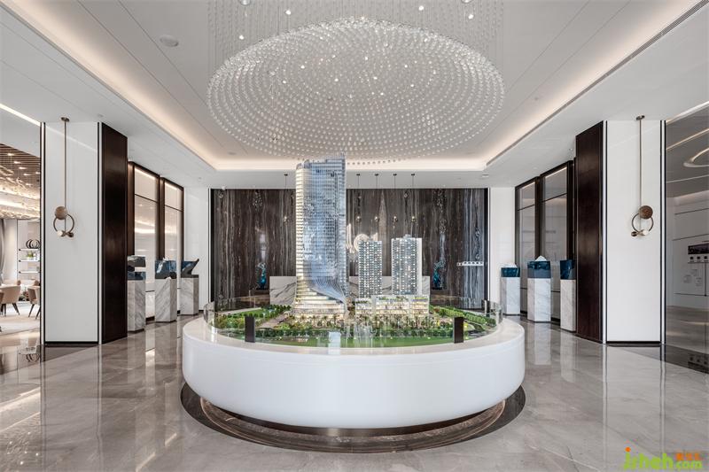 以水之和聚天地靈韻——國(guó)學(xué)五行之道的“水育萬(wàn)物,水孕聚財(cái)”為迎賓展示區(qū)的設(shè)計(jì)主題。沙盤(pán)底似白玉聚寶盆,剔透水滴形小燈珠匯聚而成的弧面水晶燈飾,猶如甘霖天降,匯入白璧無(wú)瑕的聚寶盆中,滋養(yǎng)著這片富貴天成的風(fēng)水寶地。