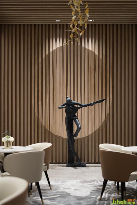 空間視覺(jué)上以具有流暢線條感的藝術(shù)曲線展現(xiàn),糅合延伸聯(lián)想聽(tīng)覺(jué)的絲弦藝術(shù)品,與項(xiàng)目建筑外觀的大氣弧形輪廓線條相呼應(yīng),展現(xiàn)建筑生命力生生不息的豐碩美好,以積極正能量樂(lè)享生活的美好訴求。