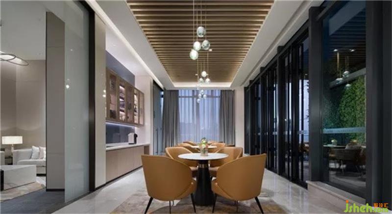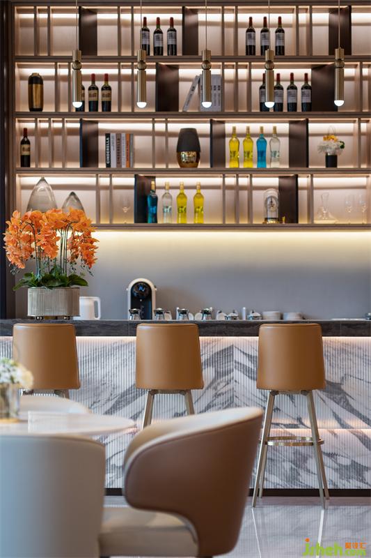 水吧臺(tái)的天然大理石突破以往鏡面打磨的常規(guī)設(shè)計(jì),通過(guò)線條精雕工藝,和諧空間中整體流暢的藝術(shù)線條,與在深淺撞色中形成錯(cuò)落別致的酒柜,在金屬水晶燈飾與暖色背景光的映襯下,刻畫(huà)現(xiàn)代時(shí)尚的輕奢韻味。