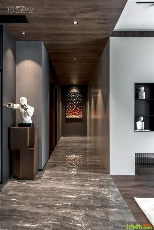 客廳與狹長的通道組合延伸,弱化了門的存在,使整個(gè)空間化零為整。輕巧的內(nèi)飾,斑斕的裝飾畫,一路延伸至視線盡頭的燈光,淡雅而寧靜,讓心靈猶如被泉水浸透過一般。