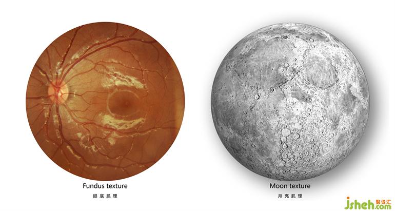 我們通過(guò)“眼底照相機(jī)”微觀眼球,是月球的肌理。我們將其打造成【睛彩】展廳設(shè)計(jì)的“超級(jí)符號(hào)”置于焦點(diǎn),總臺(tái)似“迷航”般迷失在太空之中,空間因此環(huán)繞起來(lái)。這種動(dòng)線是展廳設(shè)計(jì)師在游覽“大英美術(shù)館”所收獲的體會(huì)??v橫構(gòu)成的外觀系統(tǒng),如同管中窺豹時(shí)見(jiàn)一斑。博物館級(jí)別的棚光吸引著趨光而行的生物,畢竟在蟲(chóng)洞內(nèi)光是獲得救贖的指引。