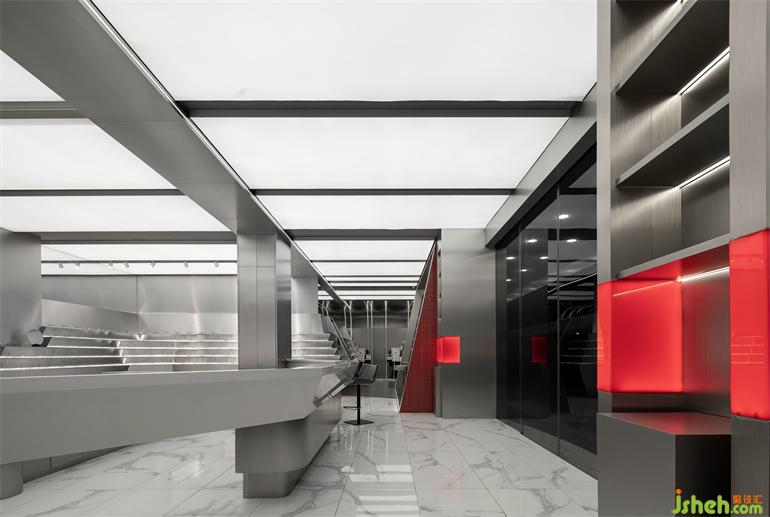 整個(gè)流線型的科技山丘,對(duì)原有的建筑邊界進(jìn)行了解構(gòu)重組。展廳設(shè)計(jì)創(chuàng)造出內(nèi)外之間多變的空間交互關(guān)系。從最左側(cè)的山丘式陳列臺(tái),到極富戲劇感的紅色驗(yàn)光區(qū)傳達(dá)一種安全感的庇護(hù),驗(yàn)光這是一個(gè)嚴(yán)肅的過(guò)程。展廳設(shè)計(jì)讓過(guò)路的流量從外部就可以感受到品牌與產(chǎn)品力??偱_(tái)時(shí)刻保持最佳狀態(tài),等待為客人提供增值服務(wù)。最右端的紅色發(fā)光體塊,定制的LED曲面軟屏利用動(dòng)態(tài)的數(shù)字內(nèi)容快速提升空間氛圍和商業(yè)趣味。