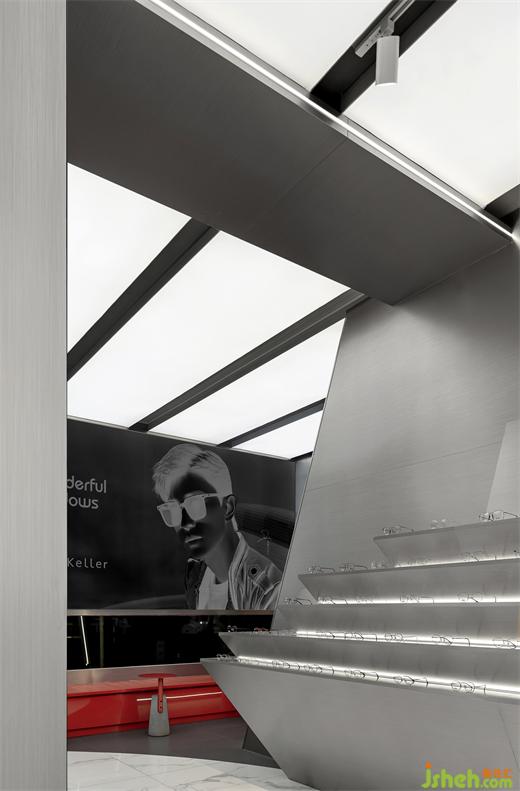金屬質(zhì)地需要光線烘托,在建筑框架內(nèi)尋變化。林彥先生的設(shè)計(jì)語(yǔ)言簡(jiǎn)潔利落,展廳設(shè)計(jì)通過(guò)這種調(diào)性營(yíng)造出品牌的專業(yè)屬性?!罢麄€(gè)配鏡過(guò)程希望如精密實(shí)驗(yàn)般考究精準(zhǔn)”扶生如是說(shuō)。