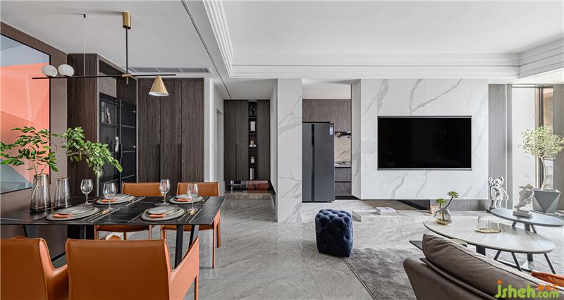 本案主要空間以現(xiàn)代雅致為基調(diào),運用現(xiàn)代主義設(shè)計手法,巧妙糅合空間與家具,打造出一個現(xiàn)代精致的輕奢空間。The main space of this case is based on modern elegance, using modern design techniques, skillfully mixing space and furniture to create a modern and exquisite light luxury space.