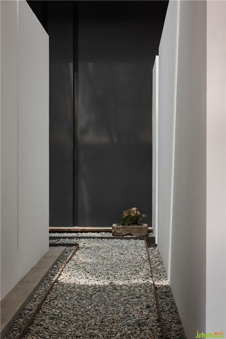 侍物府的入口由幾塊白色的片墻組合而成,形成一條狹長而靜謐的過道。質(zhì)樸的色調(diào)、干凈的線條、粗獷的石子相互碰撞,夾雜著隱隱綽綽的光影,禪意呼之欲出。