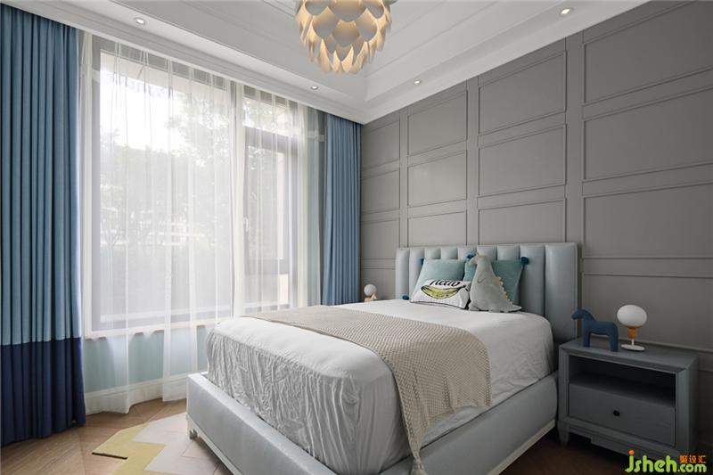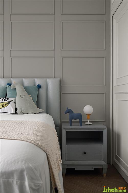 男寶寶的臥室以蒂芙尼藍(lán)色馬卡龍為主要色調(diào),中性灰色作為背景,松果燈給孩子空間增添樂趣;