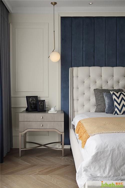 主臥以墨藍(lán)背景映襯淺色家具和墻板,幾何圖案的黃色細(xì)節(jié)點(diǎn)綴其間,床頭柜上方的球燈柔和過高的層高,金屬鏈條燈提升藝術(shù)性、增加亮點(diǎn);