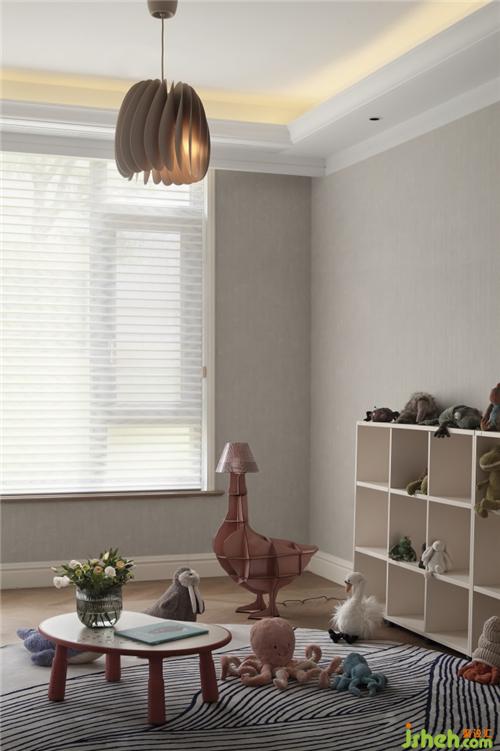 孩子玩耍的空間,這里沒有固定家具也沒有電視機(jī),只有墻面收納柜,專門用來放置孩子的玩具;