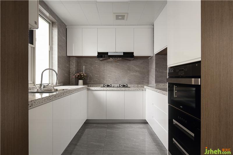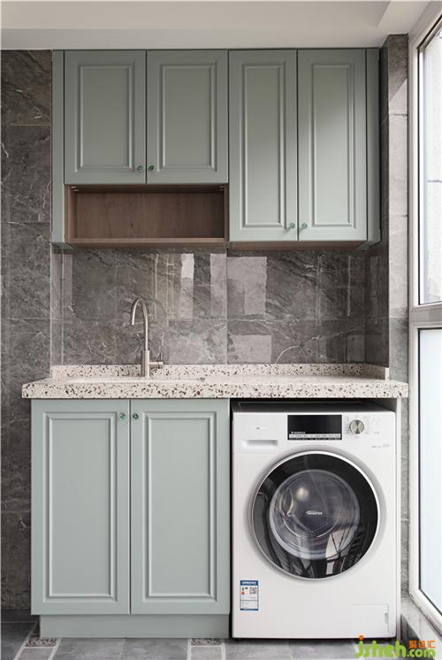 莫蘭迪綠色的柜門延續(xù)客廳色調(diào),灰色石材映襯,倍感高級;
