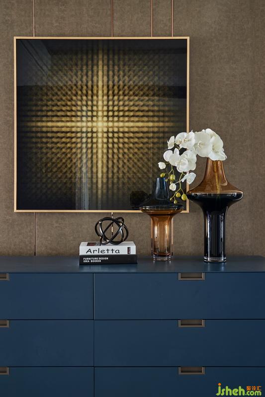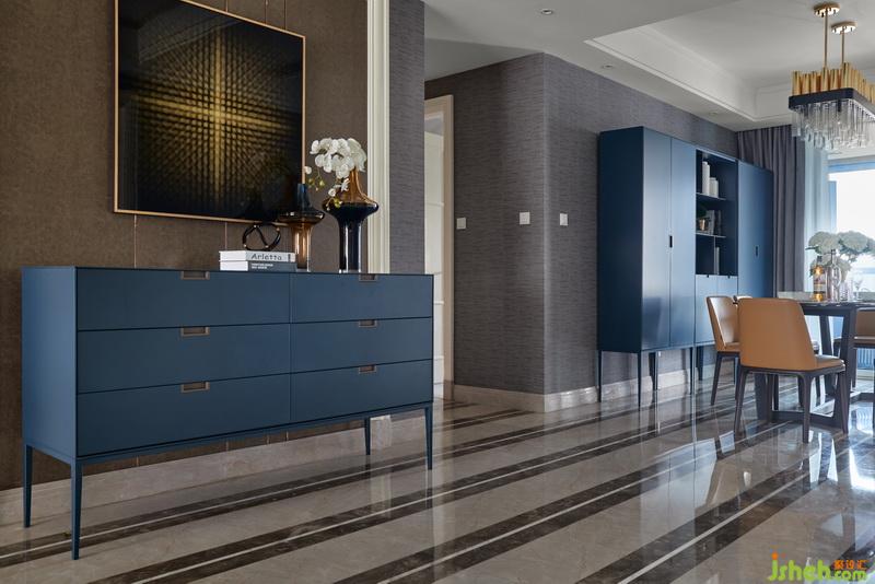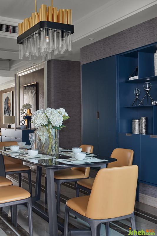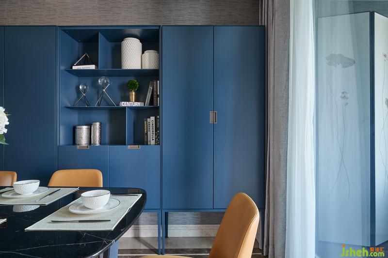 本案室內(nèi)設(shè)計(jì)師選用了藍(lán)色來(lái)點(diǎn)綴餐廳,藍(lán)色自帶一種渾然天成的貴族與優(yōu)雅氣質(zhì),不管是作為服飾還是家居環(huán)境中的工藝品,總能傳遞出一種高貴典雅范兒,凸顯出業(yè)主的獨(dú)特審美與品位。