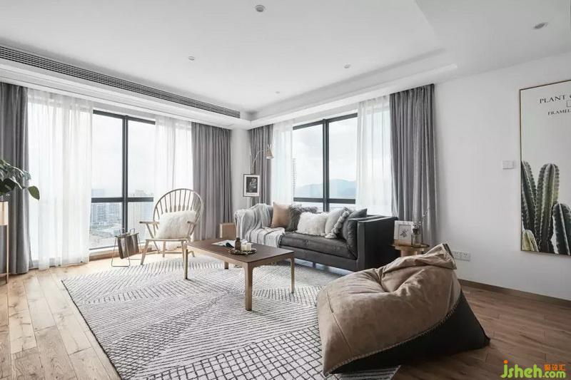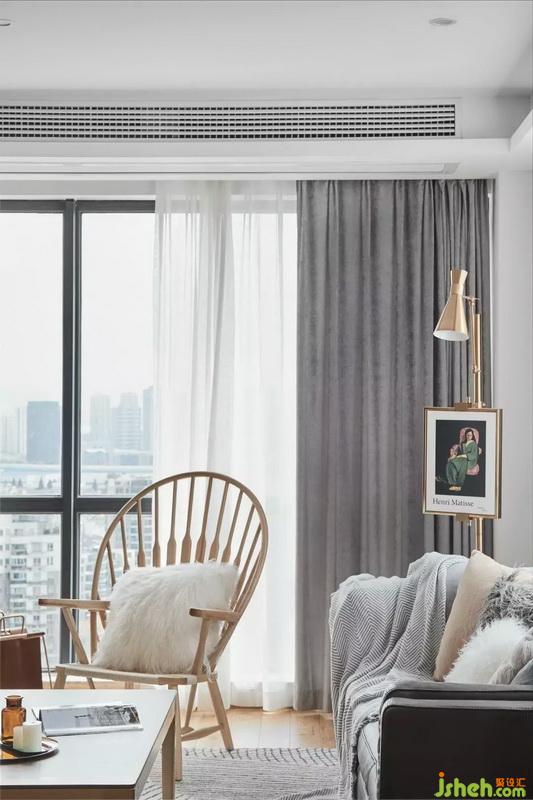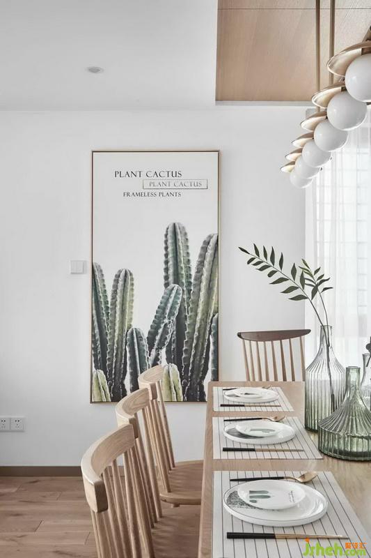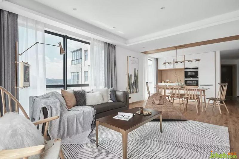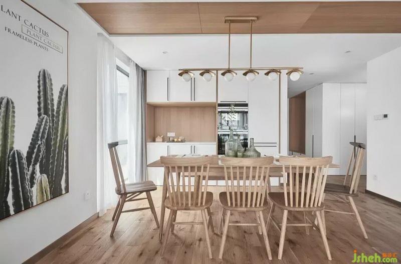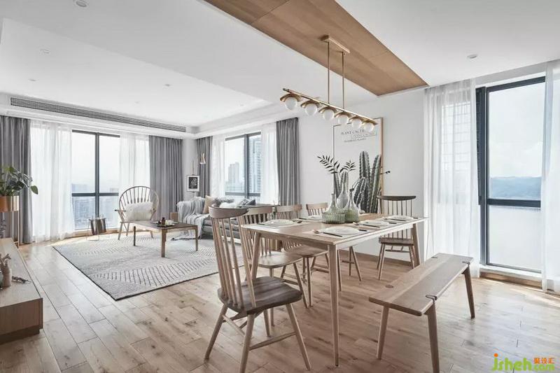 走進客餐廳后目光就被滿目的原木色所吸引,客餐廳設計公司以白色和原木色為主調(diào),搭配造型線條干練的家具,再以精簡的軟裝點綴。客餐廳一體的設計,與一線江景的視野和采光融合的非常好。