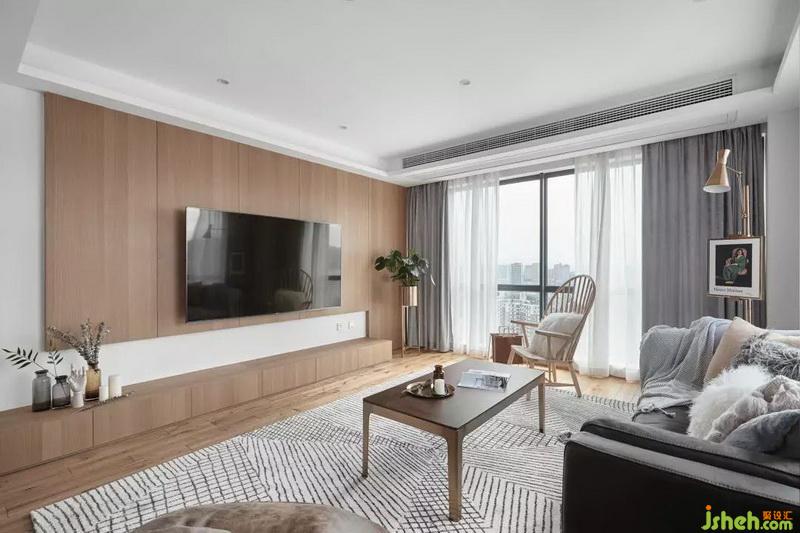 餐廳邊上做了高柜,也是廚房功能分區(qū)的延伸,而電視背景,設計公司選擇了原木色木飾面搭配白色烤漆板,精簡的線條感保證了電視背景的完整性。
