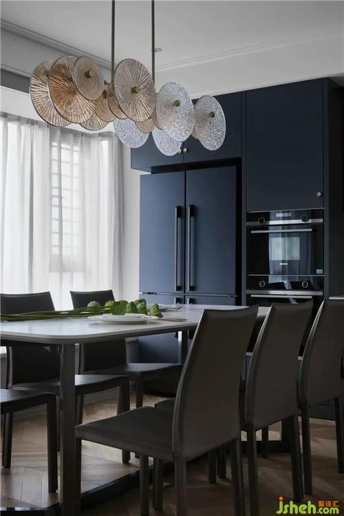 廚房深灰藍(lán)的櫥柜與墻壁上花白大理石鋪陳交匯出冷調(diào)的內(nèi)斂矜持又不失高雅的氛圍,餐桌上的水晶玻璃吊燈,溫潤(rùn)精致,充滿了藝術(shù)美。