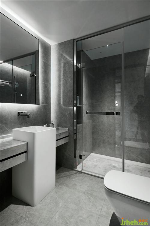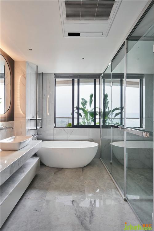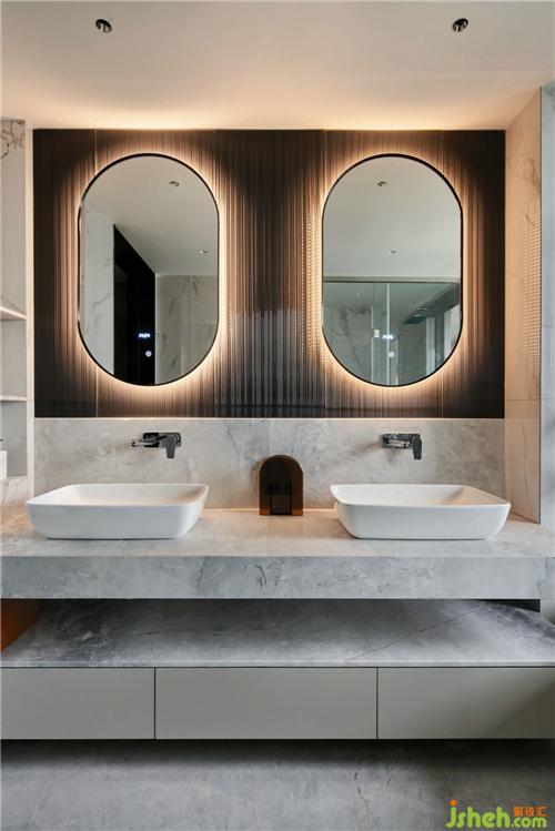 主衛(wèi)大面積淺色石材的運用,清爽明亮,黑色波紋鏡面壓低了空間的調(diào)性,裝修公司讓空間的層次輕重分明。
