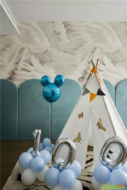 兒童區(qū)域淺藍色讓人如臨海洋,羽毛的壁紙活潑充滿張力,而小小的帳篷給予溫馨、夢幻的氛圍感。
