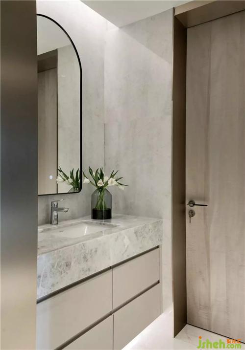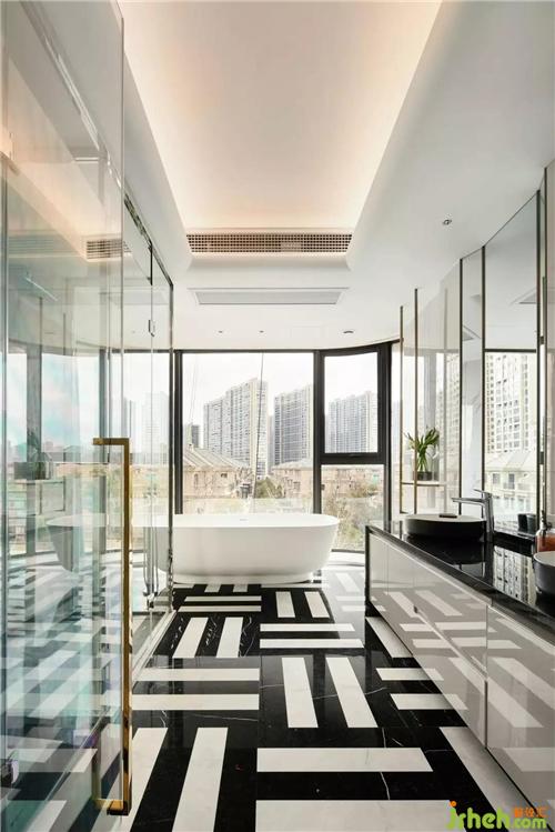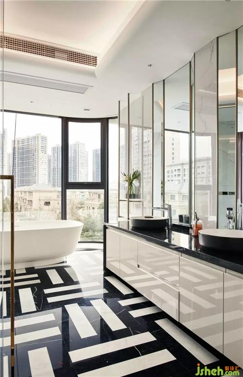 主衛(wèi)在同樣米白色基調(diào)中,加入黑白跳色的地面,增加空間時(shí)尚氛圍,獨(dú)立浴缸臨窗而置,放松泡澡的同時(shí)亦可欣賞窗外的夜色,雙臺(tái)盆的設(shè)計(jì)更加人性化。