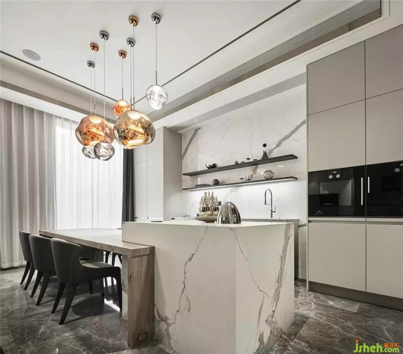 這套面積接近六百方的別墅,業(yè)主在跟設(shè)計(jì)師溝通的時(shí)候,提出一個(gè)需求要增加空間的互動(dòng)感,所以別墅裝飾設(shè)計(jì)師打破了原有的餐廳結(jié)構(gòu),設(shè)計(jì)了一個(gè)社交廚房,增強(qiáng)客餐廳的交互性。