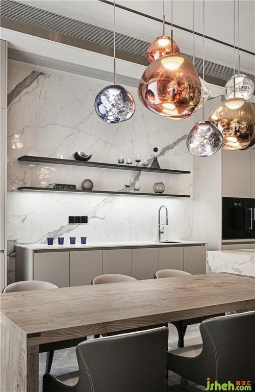 餐桌和吧臺(tái)的結(jié)合形式,除了滿足日常就餐,更增加了生活的儀式感。Tom Dixon的MELT系列吊燈極具未來(lái)感,像一組空間雕塑,不同紋路的巖板臺(tái)面也非常具有質(zhì)感,和家人一起在這里準(zhǔn)備點(diǎn)心、美食、聊天、分享趣事,這幸福的味道,大概就是“人間煙火氣,最撫凡人心”了吧。