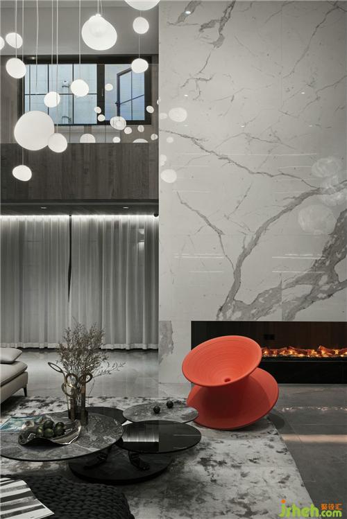 負(fù)一層挑高的空間讓地下室通透感十足,不同以往地下室低矮的壓抑感,愛(ài)馬仕橙的臺(tái)球桌和陀螺椅子,羅奇堡的旋轉(zhuǎn)茶幾,別墅裝飾搭配空中星星點(diǎn)點(diǎn)的不規(guī)則月球燈和云朵燈,整個(gè)空間充滿了奇幻趣味感。