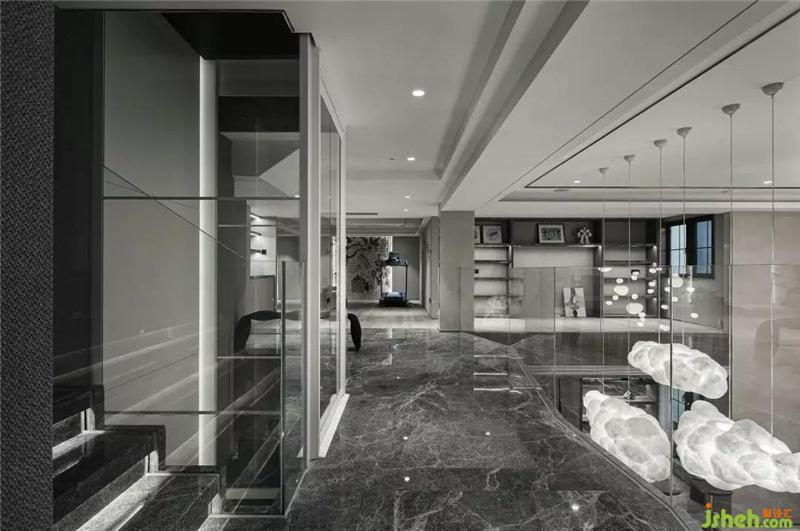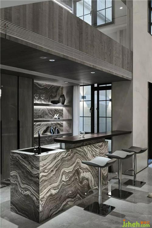 墻上的水滴藝術(shù)裝置錯(cuò)落懸掛,更加豐富了空間的靈動(dòng)性;水吧臺(tái)的大理石紋路蜿蜒起伏,充滿生機(jī)。