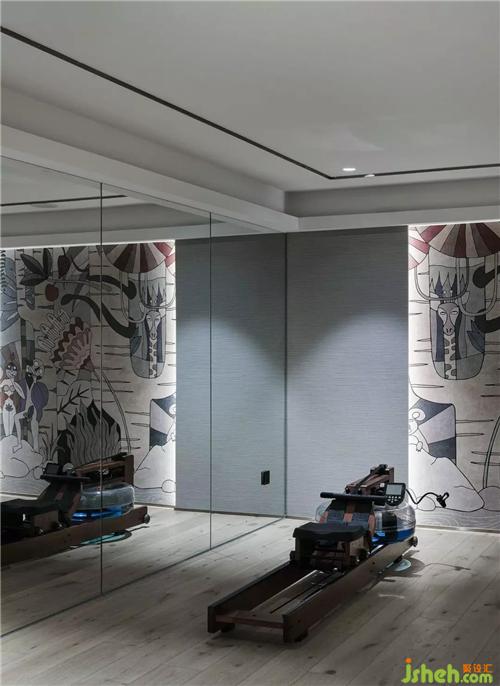 負(fù)二層挑空部分規(guī)劃出一個(gè)家庭健身房,劃船機(jī)真的是當(dāng)下最適合現(xiàn)代人的健身設(shè)備,一項(xiàng)可以坐著進(jìn)行的有氧運(yùn)動(dòng)。線性燈和整面鏡子的運(yùn)用,光與影的交錯(cuò),打造了一個(gè)理想的立體化健身空間。