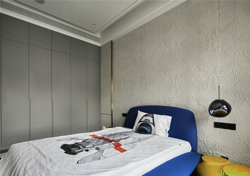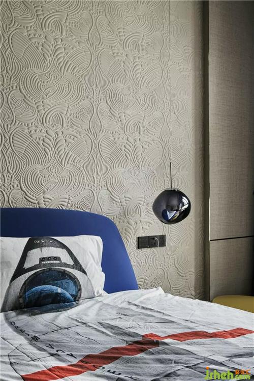 每一個孩童的內(nèi)心都有一個飛向太空的夢想,背景凹凸肌理的壁布猶如月球表面,Tom Dixon的小吊燈充滿科技感,蔚藍色的床身和宇航服的床品,都在用父母的愛告訴小朋友:勇敢的去追尋你的夢想吧!