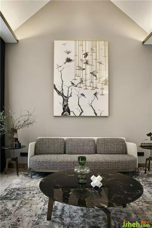 老人房配套的獨立衛(wèi)生間和起居室延續(xù)臥室基調(diào),水墨畫的背景,寧靜而高雅,“人”字型挑高屋頂,空間感更強,也進一步映射出東方氣息與現(xiàn)代生活品質(zhì)。