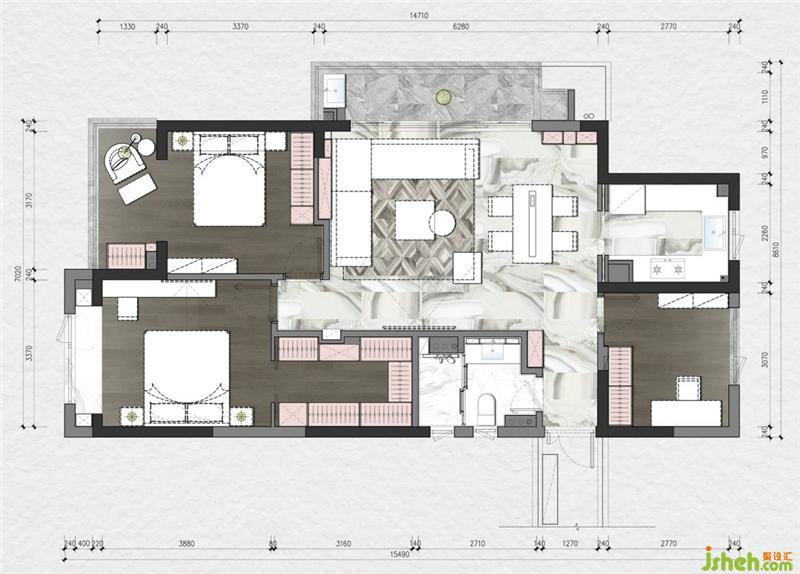 關(guān)于設(shè)計(jì):原始戶型有2個(gè)并排的衛(wèi)生間,客戶希望更多一些儲(chǔ)物空間,在杭州裝修設(shè)計(jì)師調(diào)整之后,主臥的衛(wèi)生間改為衣帽間,孩子房的陽(yáng)臺(tái)合并到臥室,空間變得整體,也更符合主人的使用需求。