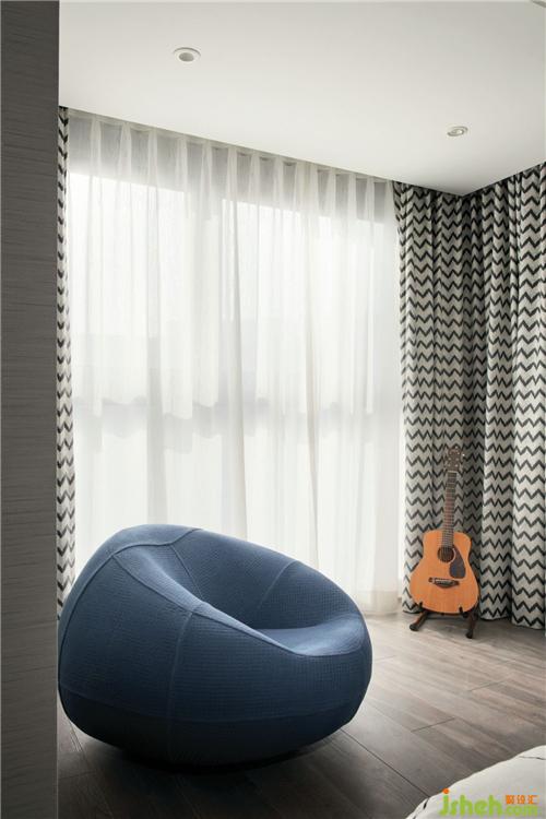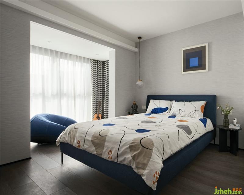 杭州裝修設(shè)計(jì)波浪紋的床頭背景搭配海藍(lán)色床頭靠背,夜晚降臨,如同沉睡在海洋之上,安撫人心,自由自在。