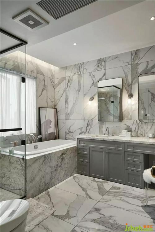 花白大理石和灰色洗手柜的簡單配色讓杭州裝修設(shè)計(jì)衛(wèi)生間顯得干凈清爽,雅致趣味。